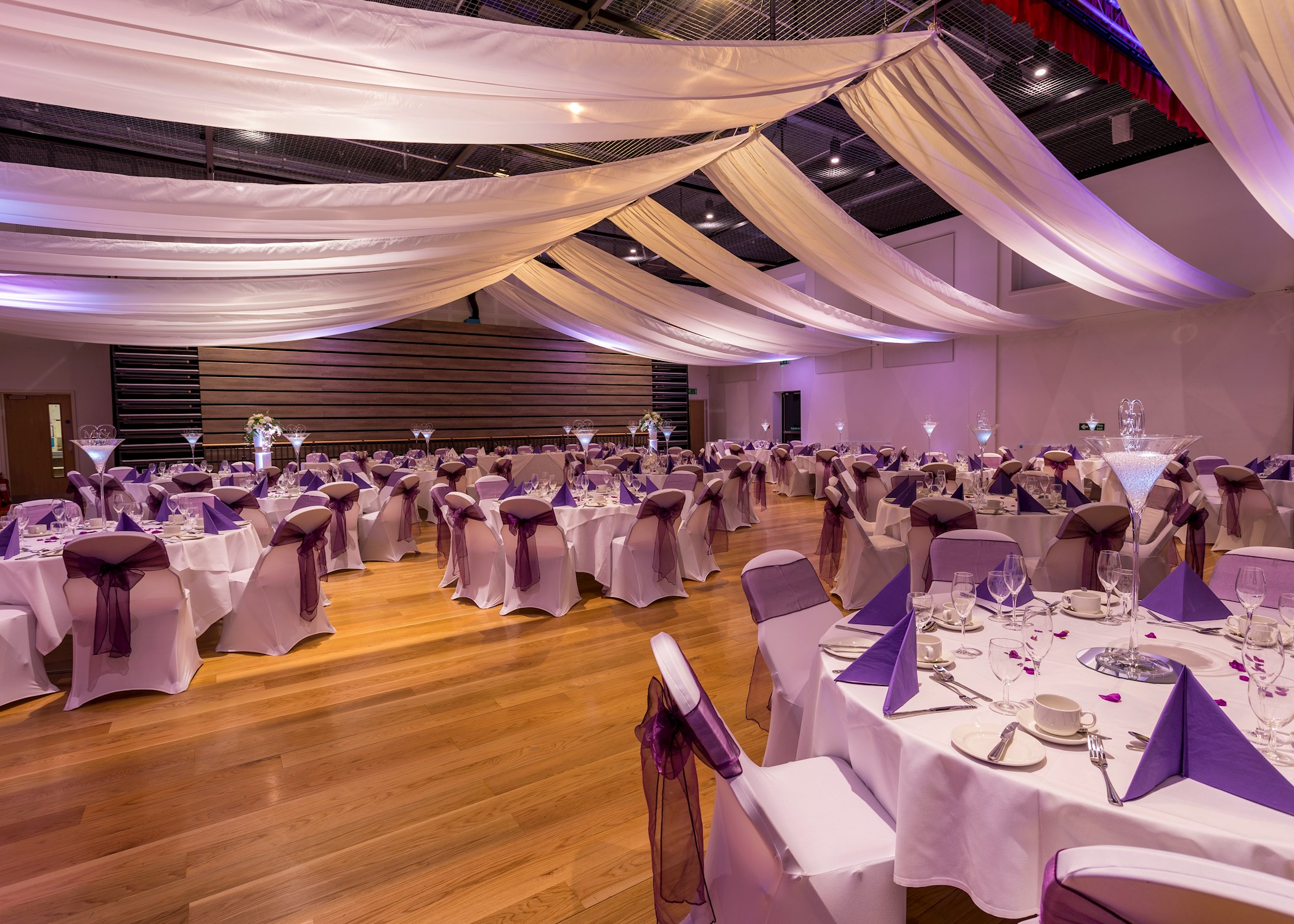 Our impressive Main Hall with bespoke draped ceiling and colour themed mood lighting can comfortably accommodate up to 180 guests for a full meal and evening reception.